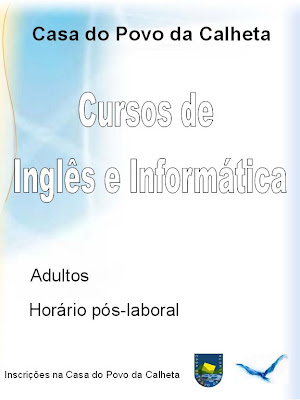 A Casa do Povo da Calheta em parceria com a Escola Básica e Secundária está a promover CURSOS DE INFORMÁTICA e INGLÊS para ADULTOS, em horário pós-laboral. Os interessados deverão fazer a sua inscrição nas instalações da Casa do Povo da Calheta, no Lombo da Estrela.