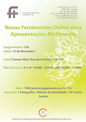 NOVAS FERRAMENTAS ONLINE PARA APRESENTAÇÕES MULTIMÉDIA Está cansado das apresentações tradicionais em PowerPoint? Deseja realizar apresentações que cativem as audiências pelo seu carácter visual e funcional? Gostava de criar Apresentações Multimédia com impacto? Os recentes avanços... Ler mais → Novembro 5, 2010 Élio Pereira Sem comentários Formar Mais