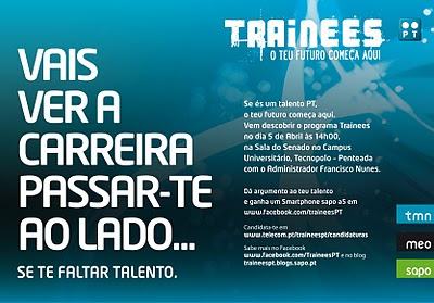 Sessão de Apresentação do Programa Trainees da PT Público alvo: Licenciados ou a finalizar licenciatura ou mestrado. Dia: 5 de Abril Hora: 14h00 Local: Campus Universitário – Penteada na Sala do Senado