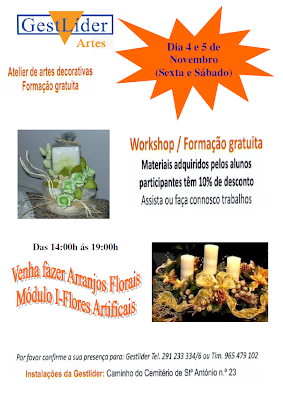 WORKSHOP ARTES DECORATIVAS – GEST LÍDER Participe no Workshop de arranjos de flores artificias - Módulo I Dia 4 e 5 de Novembro (Sexta / Sábado) Horário das 14.00h às 19.00h Atelier de artes no Caminho... Ler mais → Novembro 2, 2011 Élio Pereira Sem comentários Gestlider