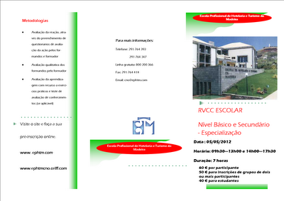 RVCC ESCOLAR A Escola Profissional de Hotelaria e Turismo da Madeira (EPHTM-CELFF), através do seu Centro Novas Oportunidades, levará a cabo uma acção de formação aberta a Profissionais de RVC, Formadores,... Ler mais → Março 29, 2012 Élio Pereira 1 Comentário Escola Profissional de Hotelaria e Turismo da Madeira