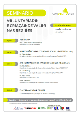 No âmbito do projecto CONSOLIDAR (formação – consultoria para diversas instituições da Economia Social da Região) a Associação Casa do Voluntário e a Proinov está a organizar o quinto Seminário,... Ler mais →