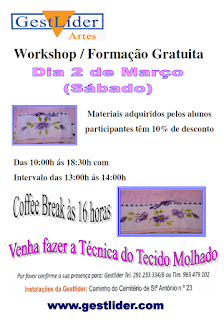 Workshop de artes decorativas se realizará no dia 2 de Março (Sábado) com horário das 10:00H às 19:00H, no atelier de artes Gestlider. Será realizada a técnicas do Tecido molhado.... Ler mais →