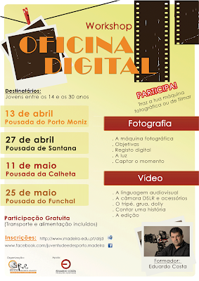 WORKSHOP OFICINA DIGITAL – DRJD A Direção Regional de Juventude e Desporto (DRJD) está a promover uma iniciativa na área da fotografia e vídeo (Oficina Digital) dirigida a jovens com idade entre os 14 e os 30... Ler mais → Abril 9, 2013 Élio Pereira Sem comentários DRJD