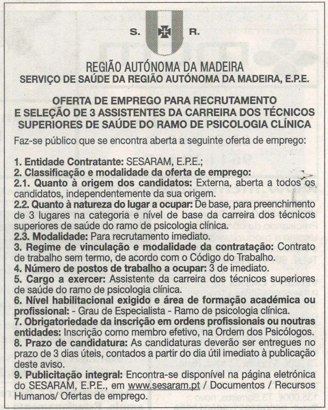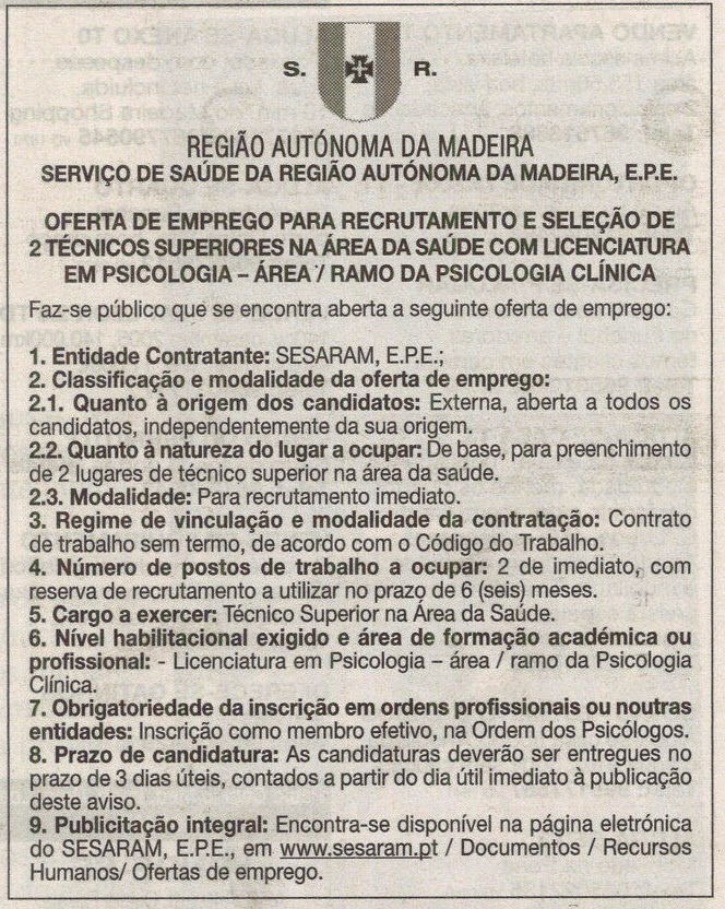 Faz-se público que se encontra aberta a seguinte oferta de emprego: 1. Entidade Contratante: SESARAM, E.P.E.; 2. Classificação e modalidade da oferta de emprego: 2.1. Quanto à origem... Ler mais →