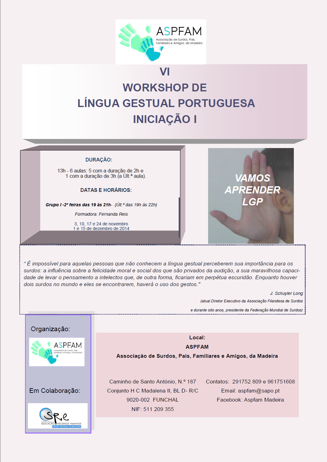 VI WORKSHOP DE LÍNGUA GESTUAL PORTUGUESA – INICIAÇÃO I FOLHETO Outubro 16, 2014 Élio Pereira Sem comentários ASPFAM
