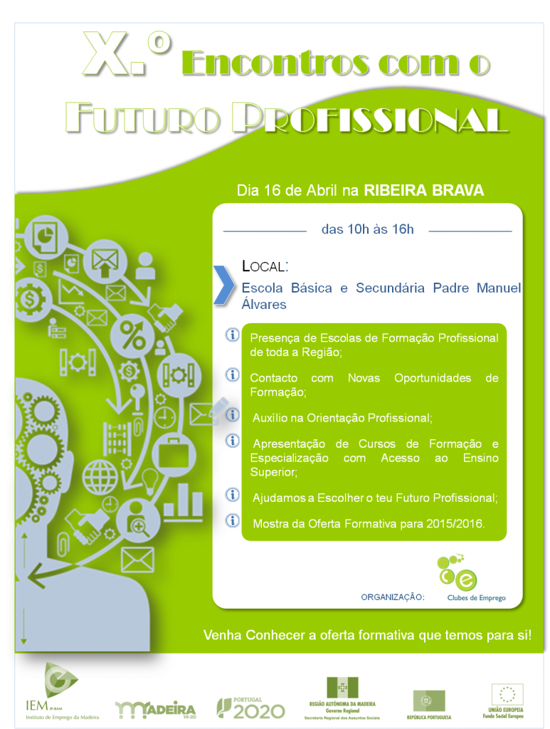 Amanhã, dia 16 de abril, entre as 10h e 16h, terá lugar, na Escola Básica e Secundária Padre Manuel Álvares, na Ribeira Brava, a Xª edição dos “Encontros com o Futuro Profissional”. A exposição contará com a presença do Presidente da Câmara Municipal da Ribeira Brava, Ricardo Nascimento.Esta iniciativa, promovida pelos Clubes de Emprego e UNIVAS da RAM, consiste numa ação coletiva de entidades de formação profissional regionais que assim apresentam e divulgam a sua oferta formativa para os jovens e adultos desempregados, de forma descentralizada e próxima dos cidadãos.