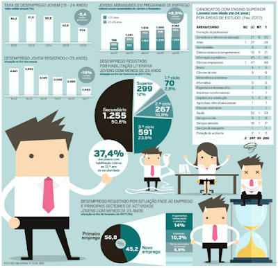 E a verdade é que, como refere o Instituto, “cerca de metade dos jovens inscritos como desempregados no final de Fevereiro de 2017 possuíam o 12.º ano de escolaridade”. E acrescenta: “Salienta-se que 337 inscritos possuíam como habilitação máxima o 2º ciclo, dos quais 70 só possuíam no máximo o 1º ciclo do ensino básico (4.º ano).” Significa que pelo menos um em cada três jovens nem sequer completou a escolaridade mínima obrigatória (desde 2014 é o 12.º ano) e sete dezenas nem sequer terminou a antiga 4.ª Classe.
