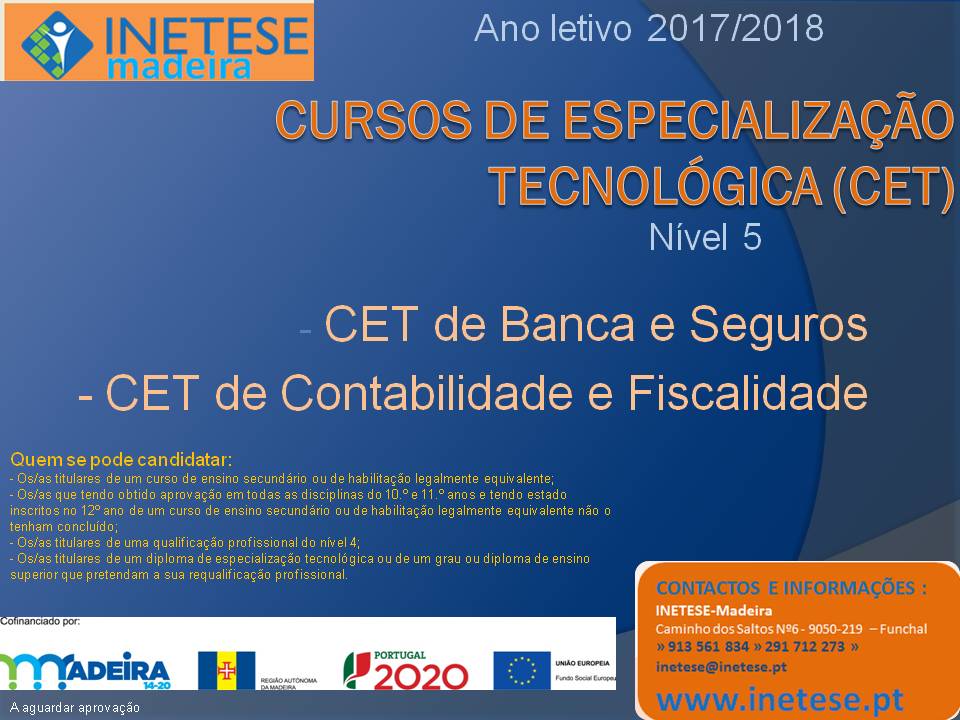 Cursos de Especialização Tecnológica CET de Banca e Seguros; CET de Contabilidade e Fiscalidade. Estes cursos têm a duração média de 16 meses e serão desenvolvidos em regime pós-laboral. Conferem... Ler mais →