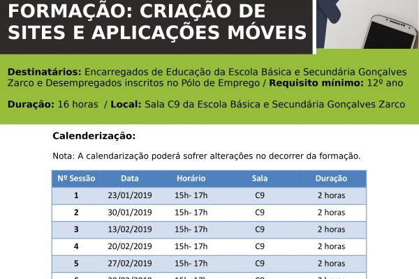A Escola Gonçalves Zarco, através do seu Polo de Emprego, irá desenvolver uma formação no âmbito da Criação de Sites e Aplicações Móveis destinada a desempregados. A Formação tem a... Ler mais →