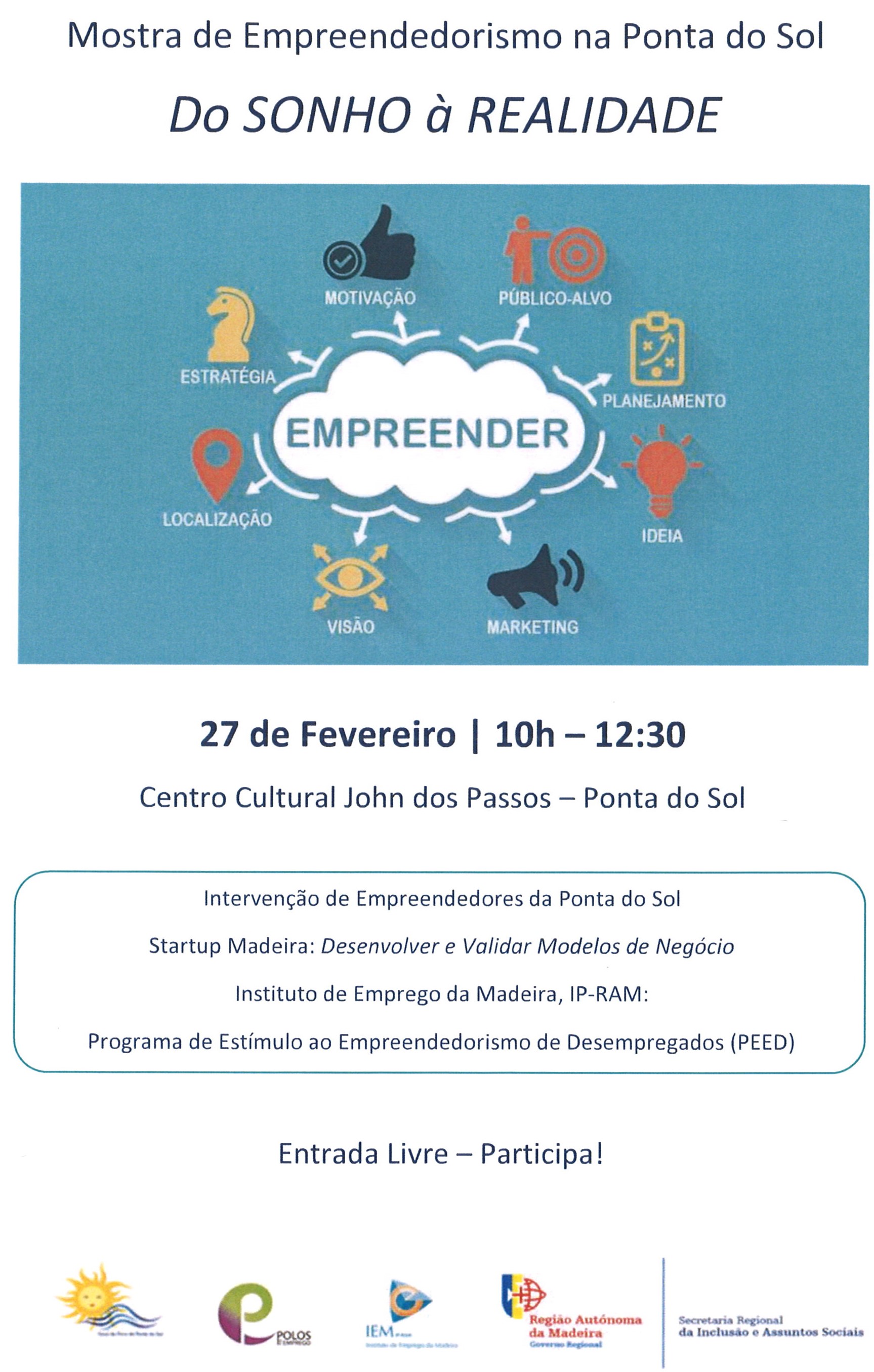 Nesta sessão vamos contar com a colaboração da Startup Madeira com o tema Desenvolver e validar planos de negócio e ainda um técnico de emprego do IEM a fim de esclarecer algumas dúvidas em relação aos programas da criação do próprio emprego e do programa de estímulo ao empreendedorismo de desempregados.