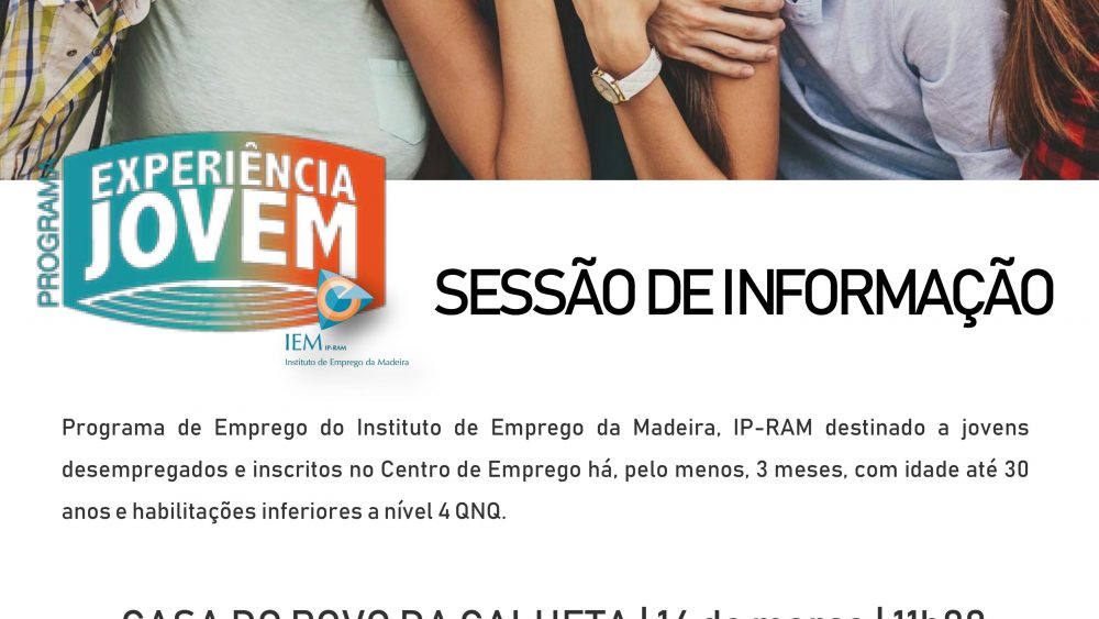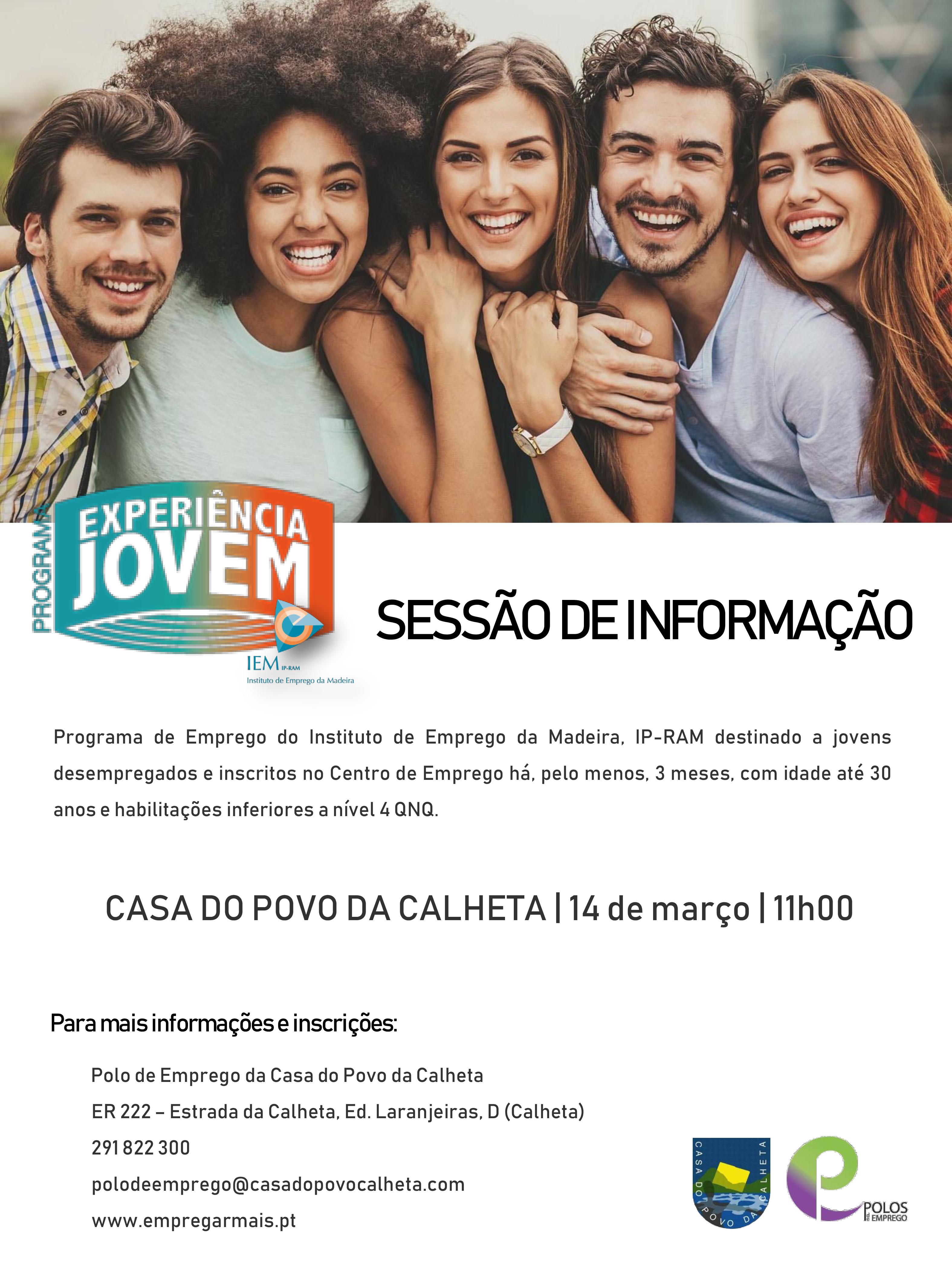 Na linha das atividades planificadas para a orientação de jovens desempregados, o Polo de Emprego da Casa do Povo da Calheta convida todos os jovens desempregados inscritos no Centro de Emprego há, pelo menos, 3 meses, com idade inferior a 31 anos e escolaridade máxima de nível 3 do QNQ, a participar na sessão de informação sobre o Programa Experiência Jovem (PEJ), medida do Instituto de Emprego da Madeira, que se realizará no próximo dia 14 de março, pelas 11h00, na Cada do Povo da Calheta, ER 222, Estrada da Calheta, 594 (Edifício Laranjeiras), freguesia e concelho da Calheta.