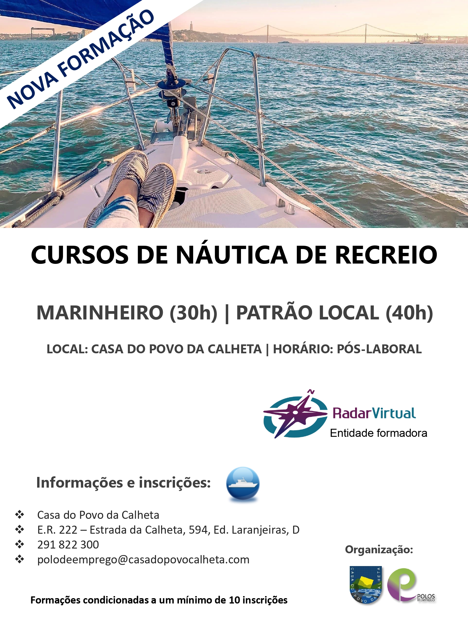 No âmbito das formações promovidas pela Casa do Povo da Calheta e pelo seu Polo de Emprego, informamos que estão abertas as inscrições para uma nova edição das formações de Marinheiro e Patrão Local.