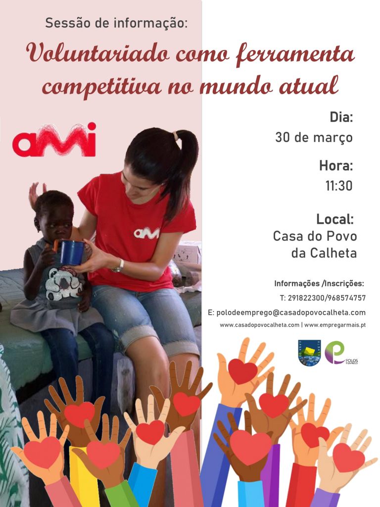 Na sequência do convite endereçado à delegação regional da AMI – Assistência Médica Internacional, o Polo de Emprego da Casa do Povo da Calheta está a promover uma sessão de informação denominada por ‘Voluntariado como ferramenta competitiva no mundo atual’, de forma a sensibilizar para a importância do voluntariado.