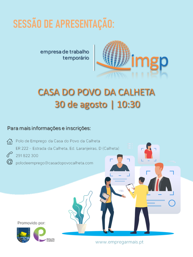 O Polo de Emprego da Calheta irá acolher, no próximo dia 30 de agosto, às 10h30, na Casa do Povo da Calheta, uma sessão de divulgação da empresa de trabalho temporário IMGP, com sede na RAM, que pretende não só apresentar os seus serviços e áreas de atuação, como também divulgar o que tem para oferecer aos desempregados.