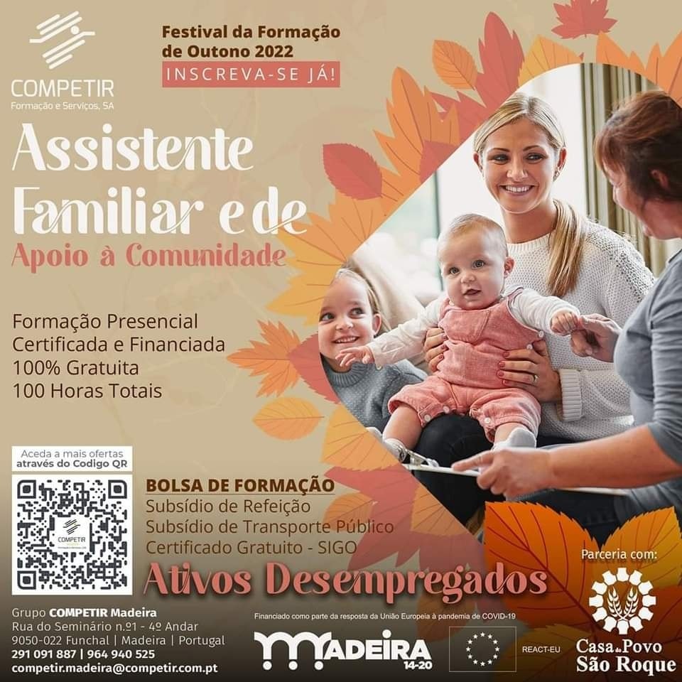 Terminou no passado dia 22 de dezembro, em São Roque, o Curso de Técnico de Assistente Familiar e de Apoio à Comunidade, um projeto financiado pelo FSE através do Madeira 1420 REACT – EU. A formação foi ministrada pela empresa de formação COMPETIR Madeira e abrangeu 12 desempregados residentes em São Roque.