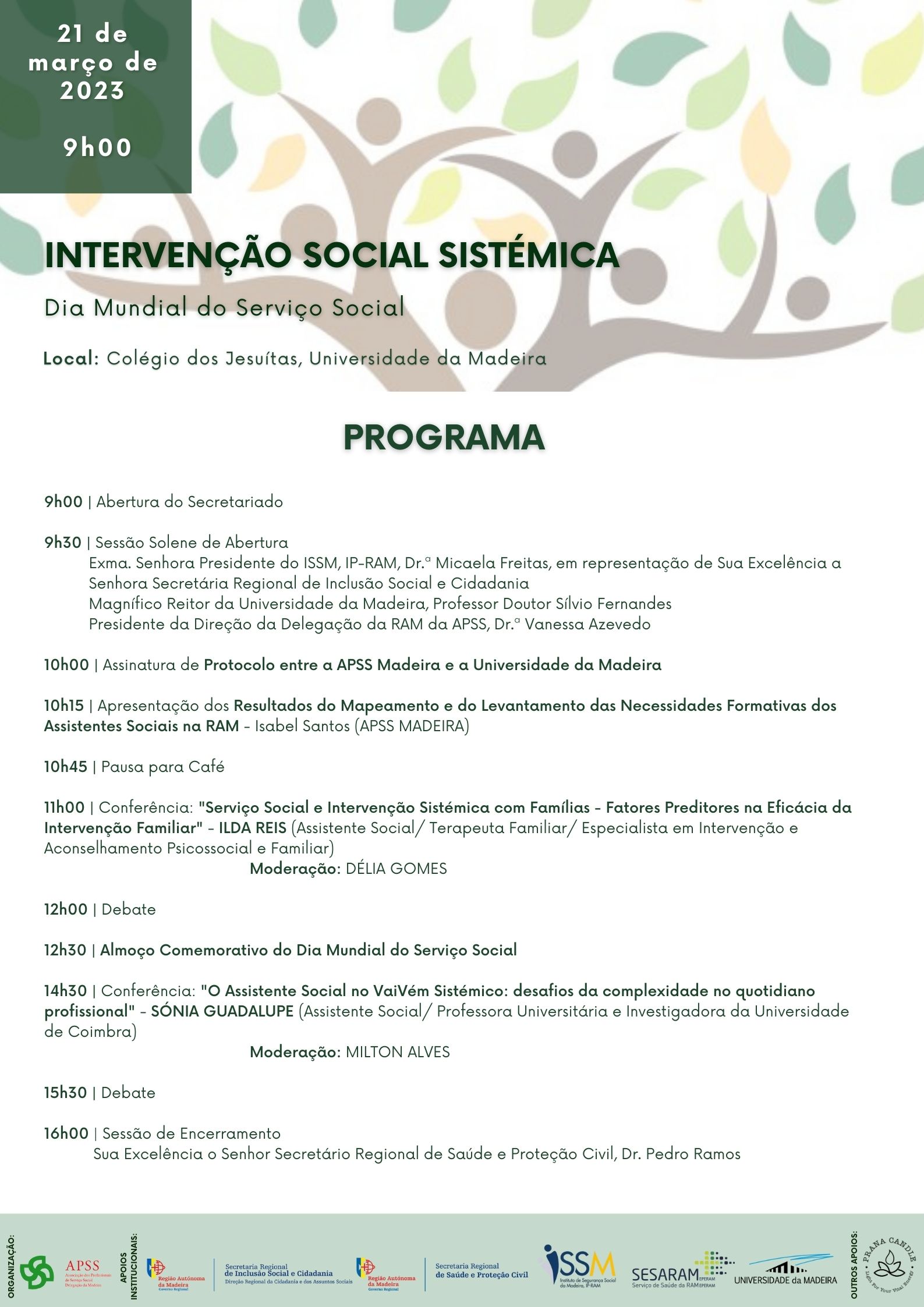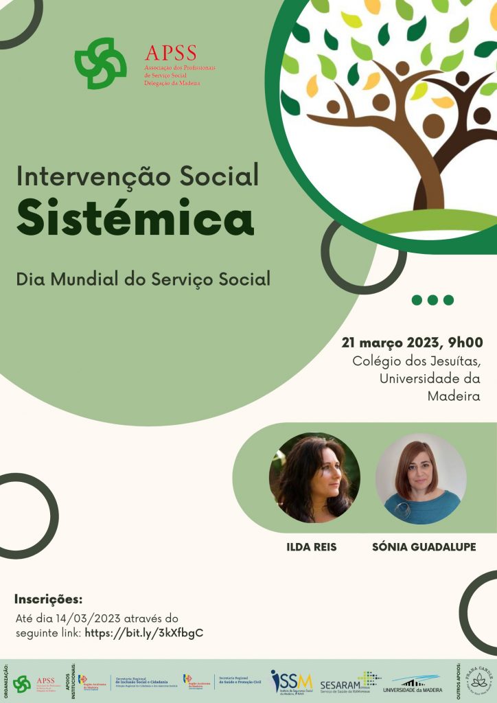 A Delegação Regional da Madeira da Associação dos Profissionais de Serviço Social (APSS) vem pelo presente divulgar a iniciativa subordinada ao tema Intervenção Social Sistémica, que decorrerá no dia 21 de março de 2023, pelas 9h00, no Colégio dos Jesuítas.