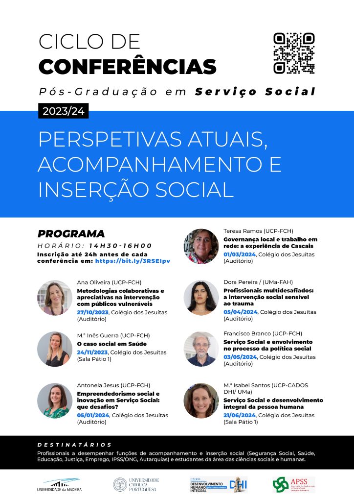 Esta iniciativa integra o Ciclo de Conferências “Perspetivas Atuais, Acompanhamento e Inserção Social”, a decorrer durante o ano letivo 2023/24 na Universidade da Madeira, no âmbito da Pós-Graduação em Serviço Social, numa parceria com a Universidade Católica Portuguesa (cartaz em anexo).