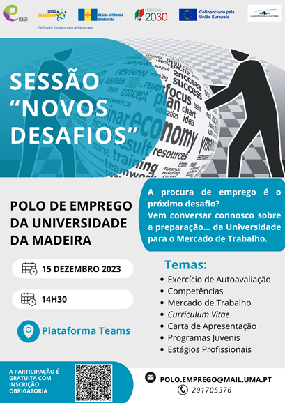 O Polo de Emprego da UMa convida-vos a participar na Sessão online “Novos Desafios”, através da Plataforma Teams, no próximo dia 15 de dezembro, às 14h30.