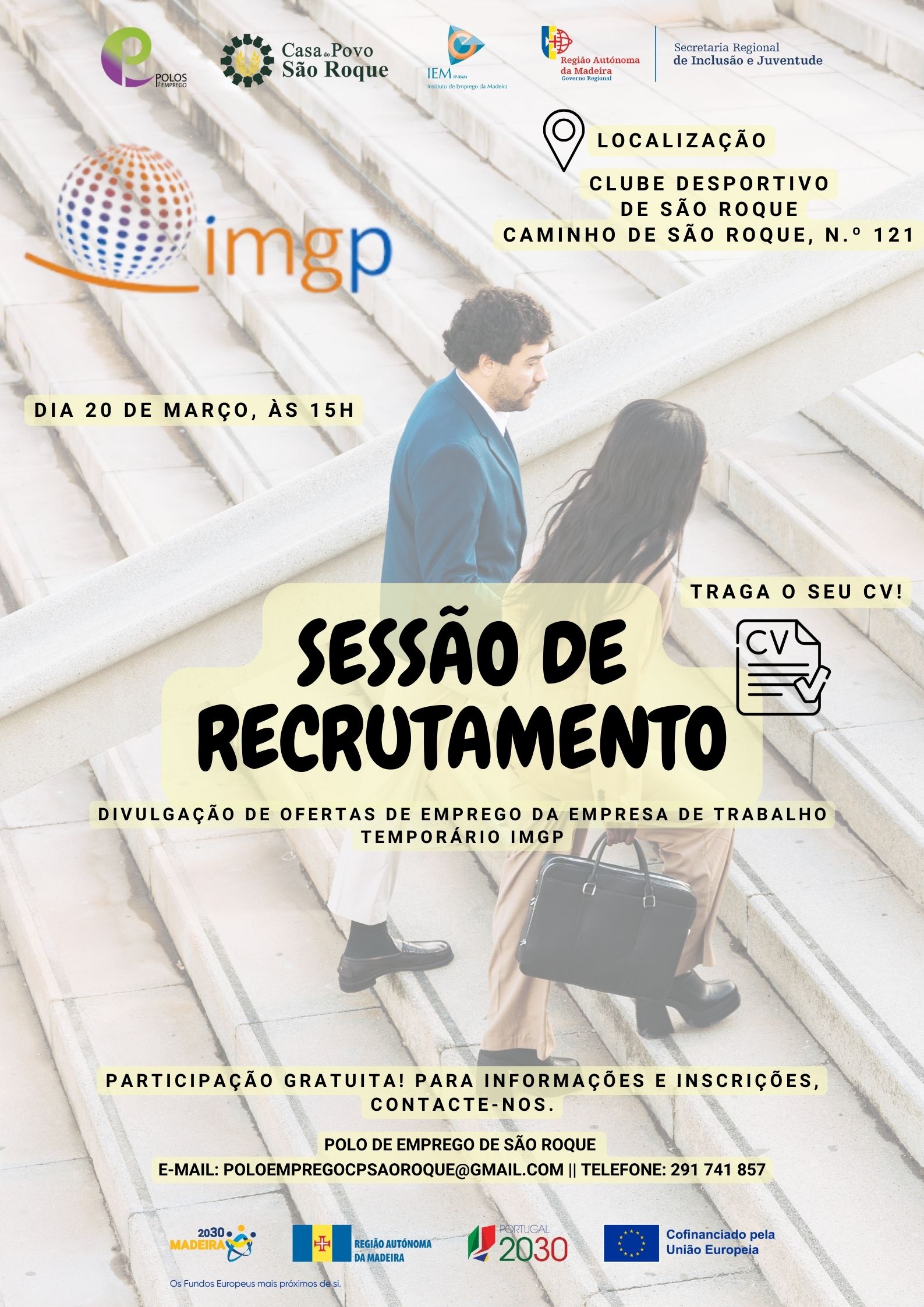 O Polo de Emprego da Casa do Povo de São Roque, em colaboração com a IMGP Engineering Lda., tem o prazer de anunciar uma sessão de recrutamento e de divulgação de ofertas de emprego a ter local na freguesia de São Roque.