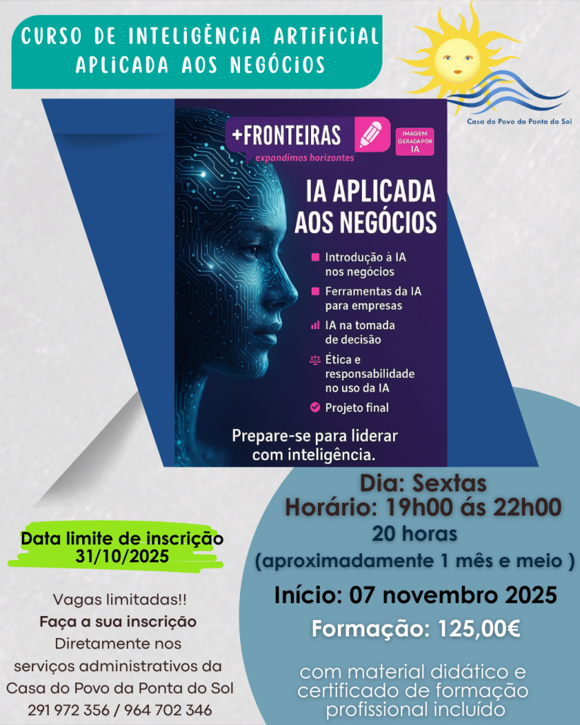 CURSO DE INTELIGÊNCIA ARTIFICIAL APLICADA AOS NEGÓCIOS Outubro 16, 2025 Élio Pereira Sem comentários Casa do Povo da Ponta do Sol, Mais Fronteiras