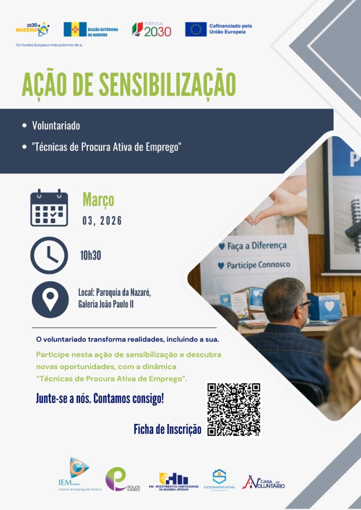 No próximo dia 3 de março, às 10h30, na Paróquia da Nazaré – Galeria João Paulo II, será promovida uma ação de sensibilização com o objetivo de promover o voluntariado e apresentar estratégias práticas de procura ativa de emprego.