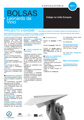 Estão abertas as inscrições para 26 bolsas Leonardo da Vinci. O prazo para inscrição termina no dia 6 de Maio de 2011. A empresa Globaladamastor é beneficiária destas bolsas e estão a receber... Ler mais →