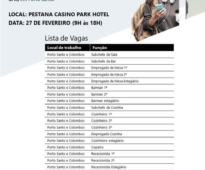O POLO DE EMPREGO DA CASA DO POVO DA CALHETA ENCONTRA-SE A RECRUTAR CANDIDATO(S) NA(S) SEGUINTE(S) ÁREA(S): PROFISSÃO: Cozinheiro (M/F). RAMO DA ATIVIDADE: Estabelecimento hoteleiro. POSTOS DE TRABALHO: 1 LOCAL DE TRABALHO: Estreito da Calheta (Calheta). REQUISITOS: Com experiência na área. ESCOLARIDADE: Escolaridade Mínima. HORÁRIO: 40 horas/semanais entre as 7:00 e as 22:00 (em conformidade com o... Ler mais  →