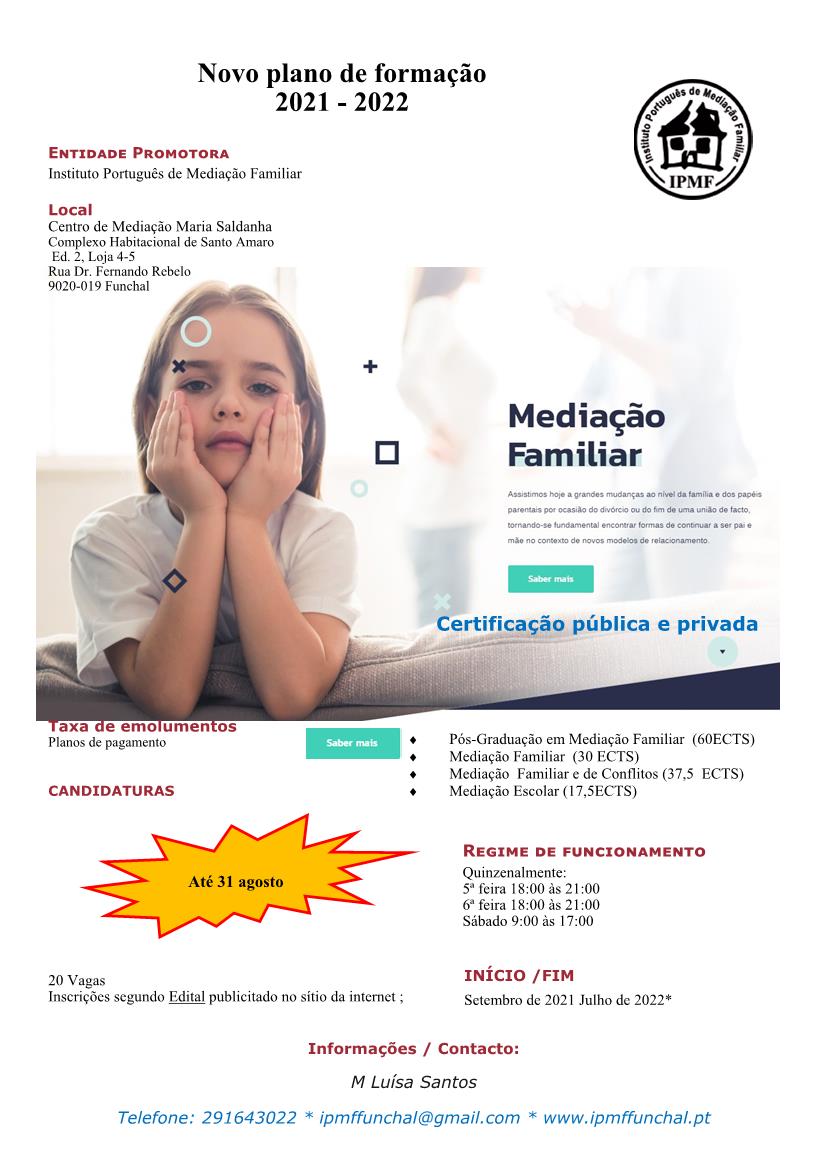 Informamos a todos os interessados que o Instituto Português de Mediação Familiar do Funchal disponibiliza cursos de formação em Mediação para o ano letivo 2021-2022, conforme informação anexa.