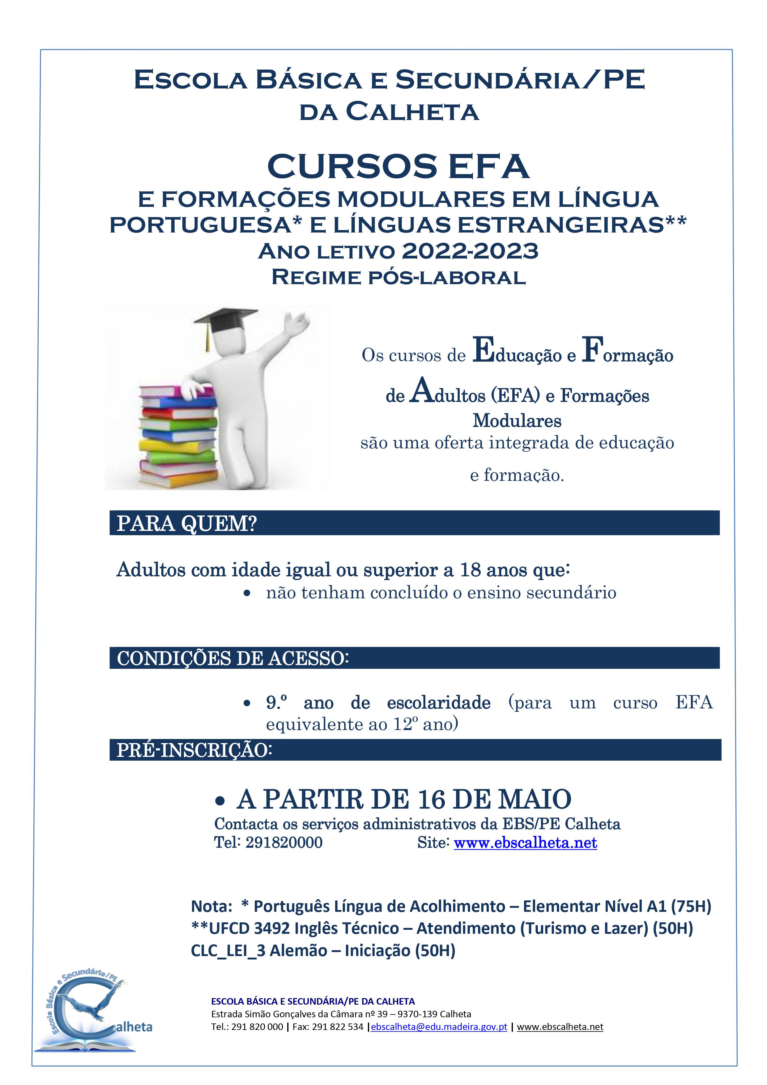 Arrancam no dia de hoje, as pré-inscrições dos Cursos de Educação e Formação de Adultos (EFA) e formações modulares em Língua Portuguesa (Elementar Nível A1 -75H) e Línguas Estrangeiras (Inglês Técnico – Atendimento (Turismo e Lazer) e Alemão – Iniciação), na Escola Básica e Secundária/PE da Calheta.