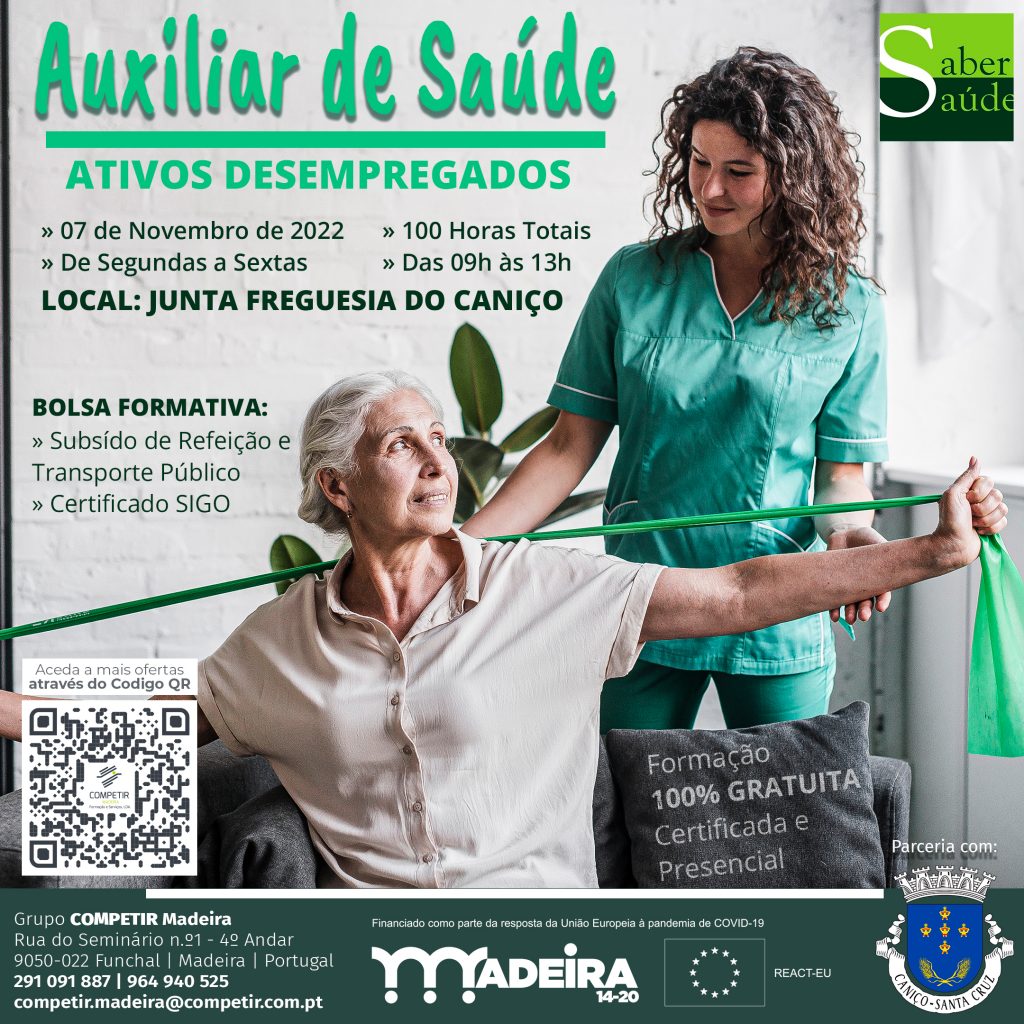A Junta de Freguesia do Caniço em parceria com a entidade formadora certificada, COMPETIR Formação e Serviços, irá realizar um curso de formação de “AUXILIAR DE SAÚDE” para ativos desempregados. Esta formação terá início a 07 de Novembro e decorrerá na Junta de Freguesia do Caniço, de segunda a sexta-feira, das 09h00 às 13h00.