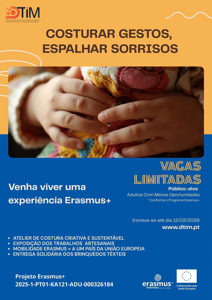 A DTIM – Associação Regional para o Desenvolvimento das Tecnologias de Informação vem, por este meio, dar a conhecer o novo projeto Erasmus+ “Costurar gestos, espalhar sorrisos”, no âmbito da Educação de Adultos.